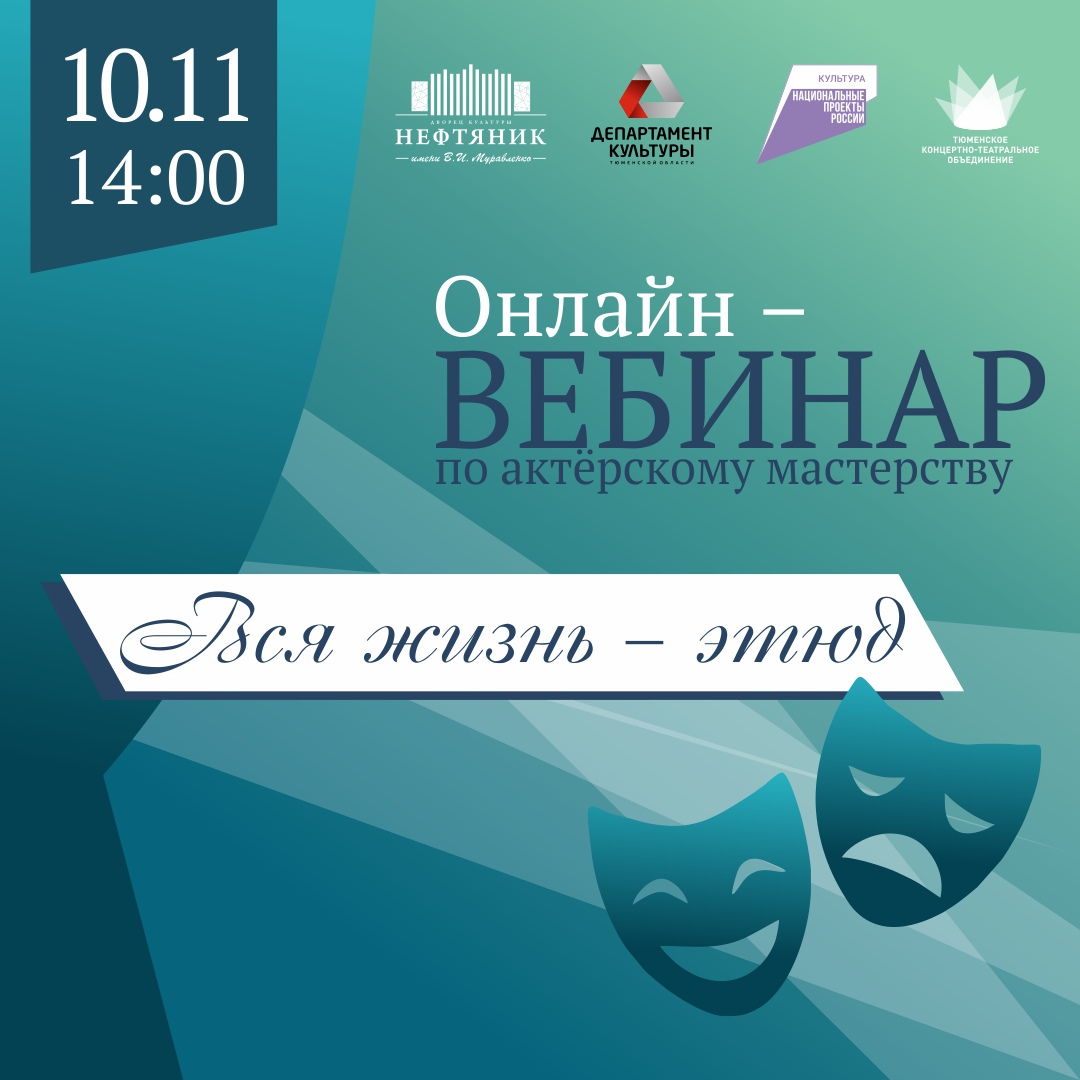 Приглашаем на вебинар по актёрскому мастерству «Вся жизнь – этюд». Трансляция начнется в 14 часов. На вебинаре будут пройдены основные темы наблюдения за объектами и изменение отношения к ситуации, человеку. На их базе строятся этюды, схема создания самой этюдной формы.