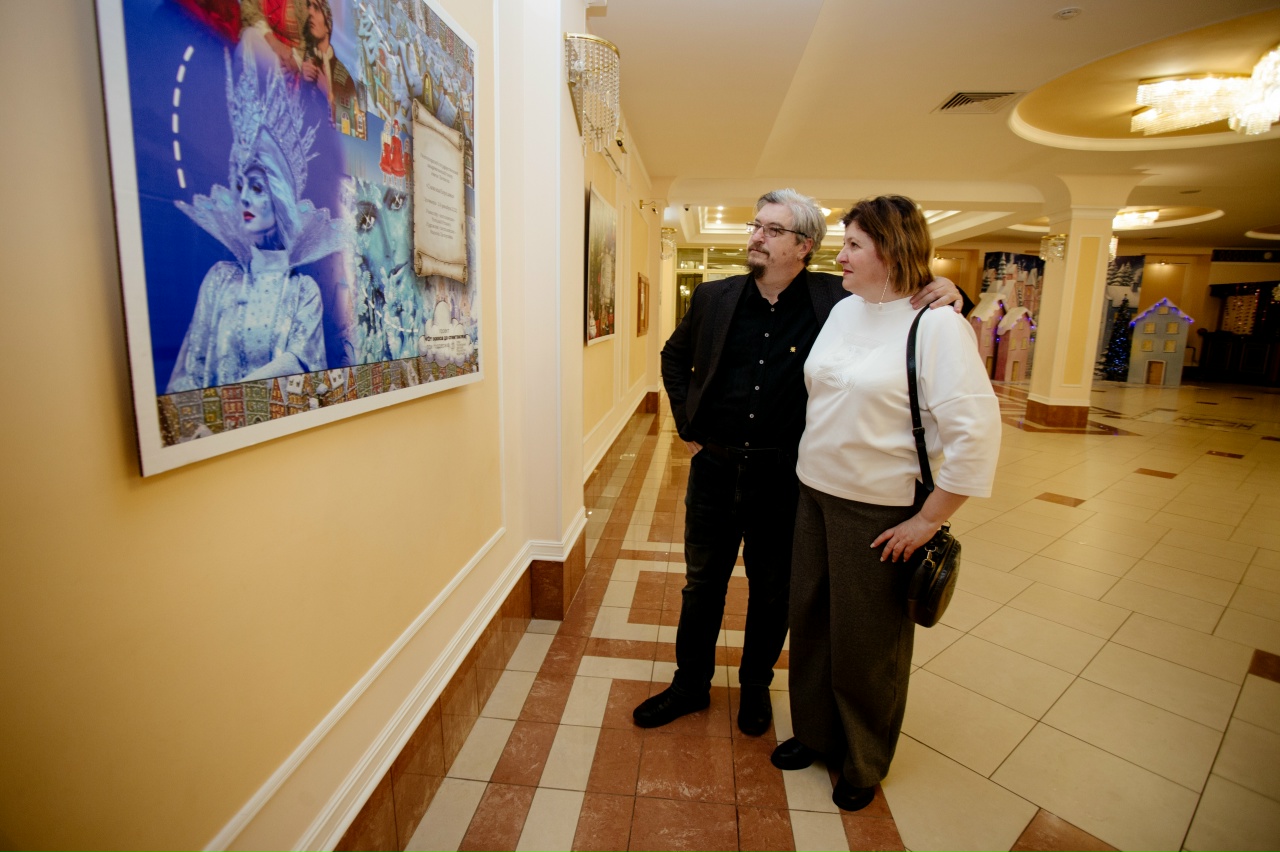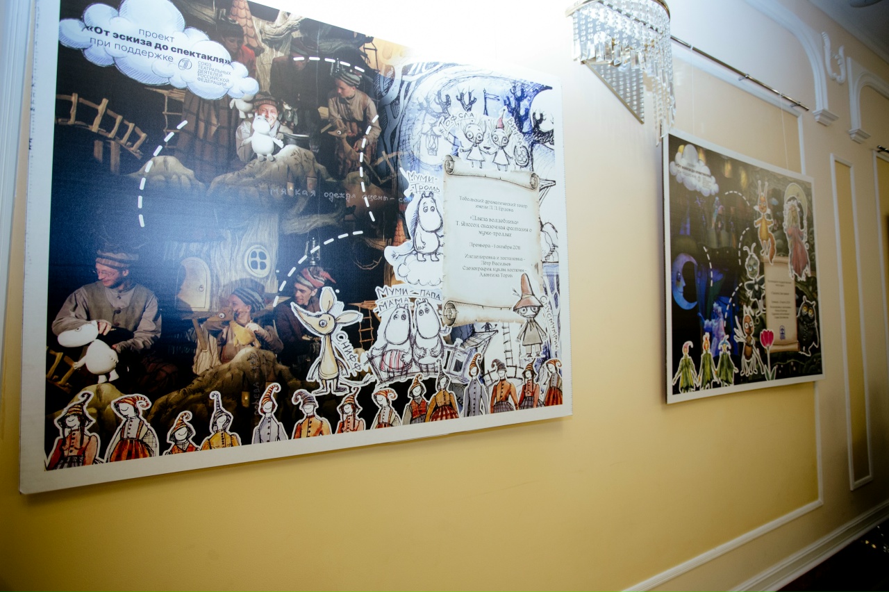 В дни показа новогодних представлений Большое фойе филармонии украшают эскизы костюмов и декораций к детским спектаклям, которые обычно остаются скрытыми от зрителей.